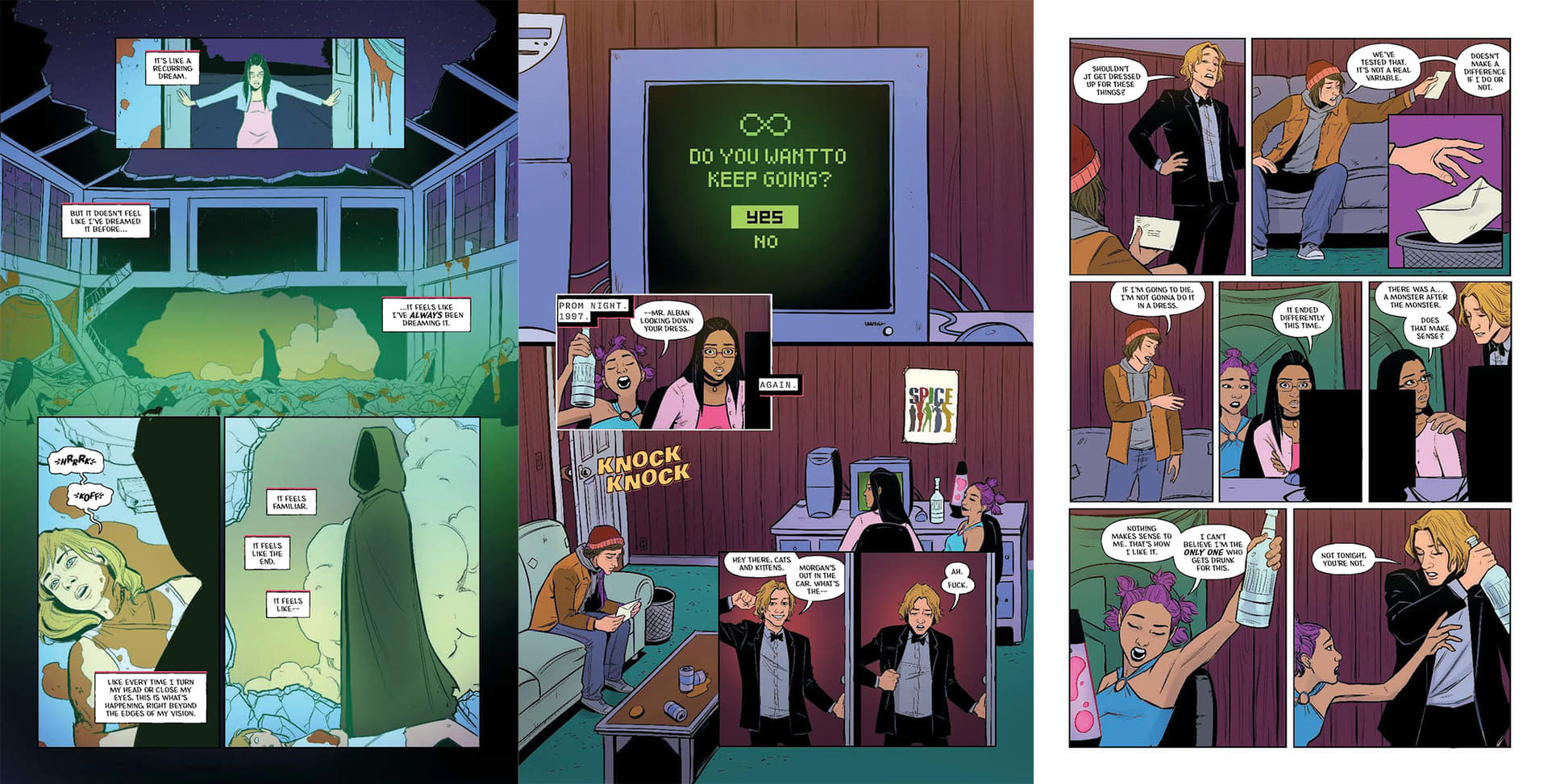 Yeah. I really liked I mean, the trying to figure out where I, like, was in the story, like, what exactly is happening is, like, the first couple of pages kind of revealed themselves, I thought was a lot of fun. And, I mean, I Caitlin, I wanted to ask you because there is a series where because it's a loop, we see how some of these loops end in really horrific ways. I don't even wanna spoil any of them because, like, as I got through each panel, it was, like, so much fun. But, you know, Caitlin, coming off of, like, living hell where you you, you got to do, you know, some things that were, well, for lack of a better word, like, hellish, but then to really like, some of the things you had to draw in this.