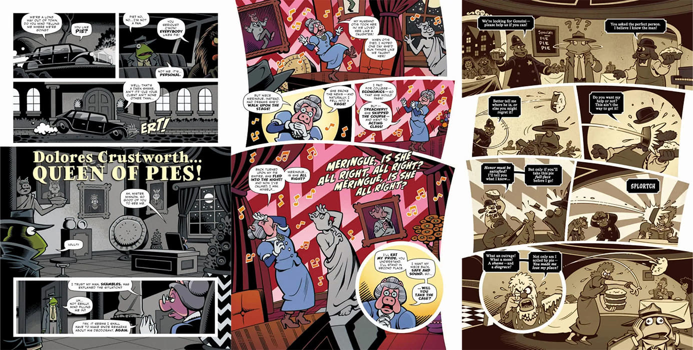[00:01:51] But can you just tell listeners a little bit about what they can expect from Muppets Noir? Sure. It's, I mean, as the title suggests, it's sort of set in a film noir kind of environment. I guess the setup is that Kermit is sitting backstage at the Muppet Theatre. He's reading a detective novel and it gets clonked on the head by a brick by one of the acts.